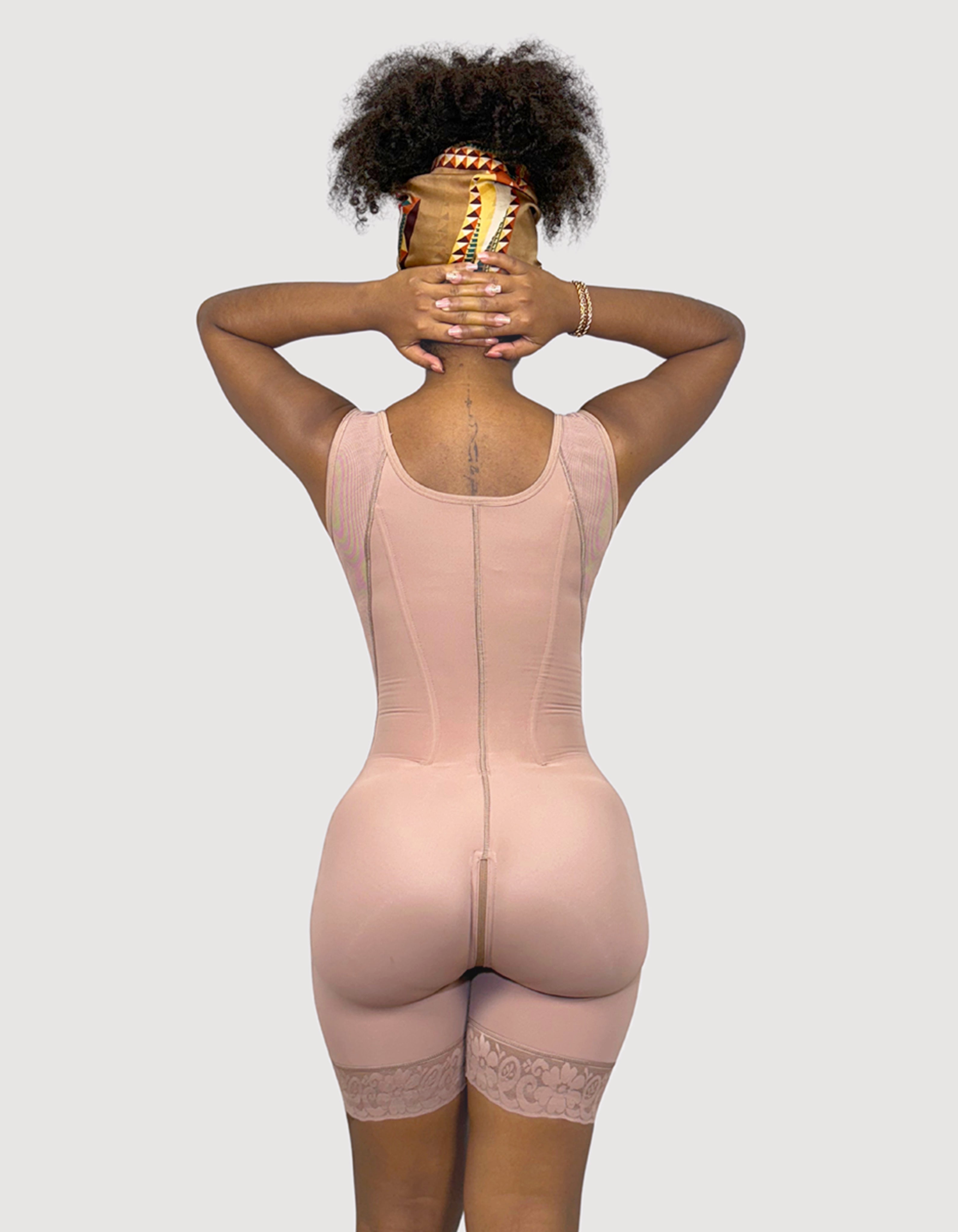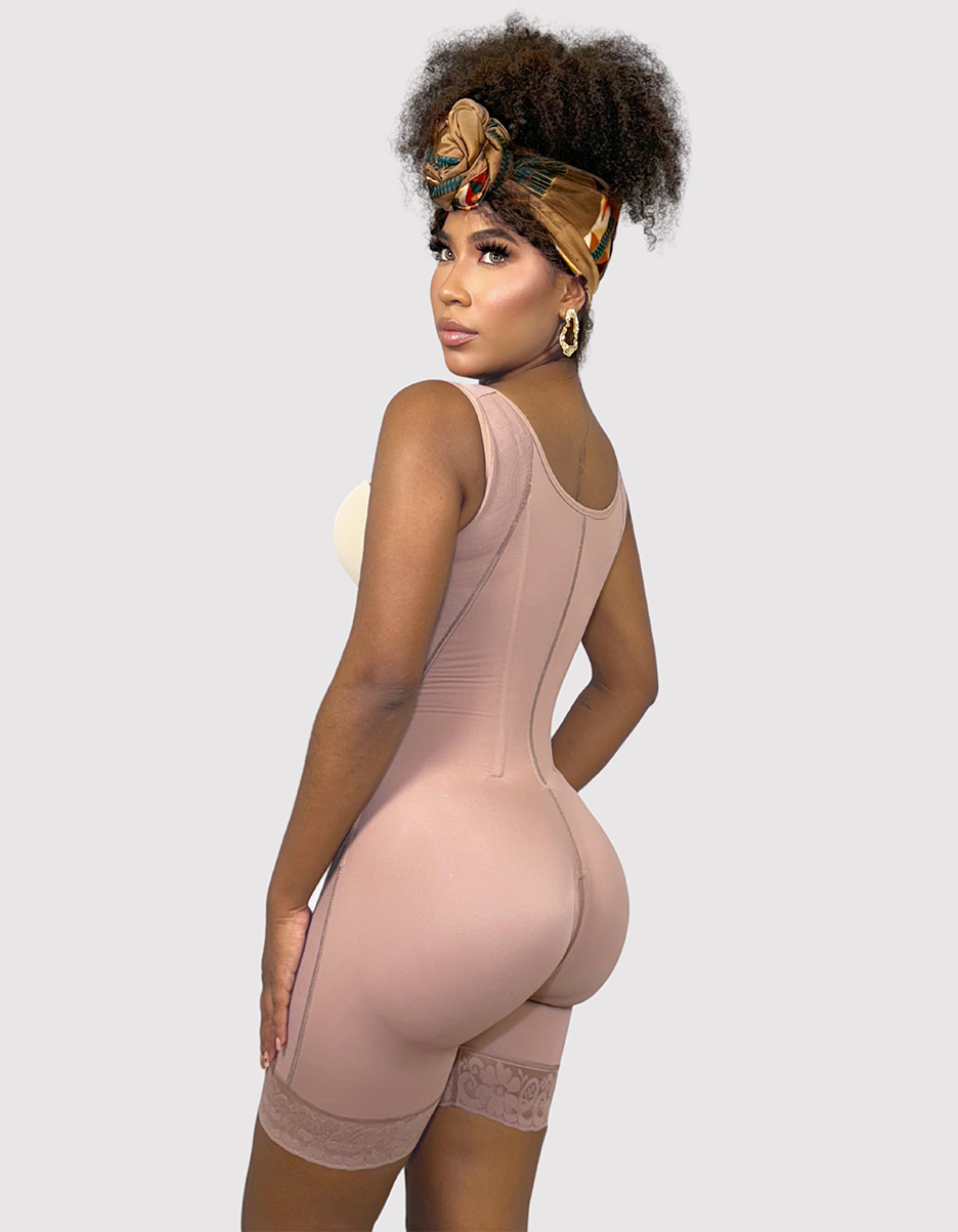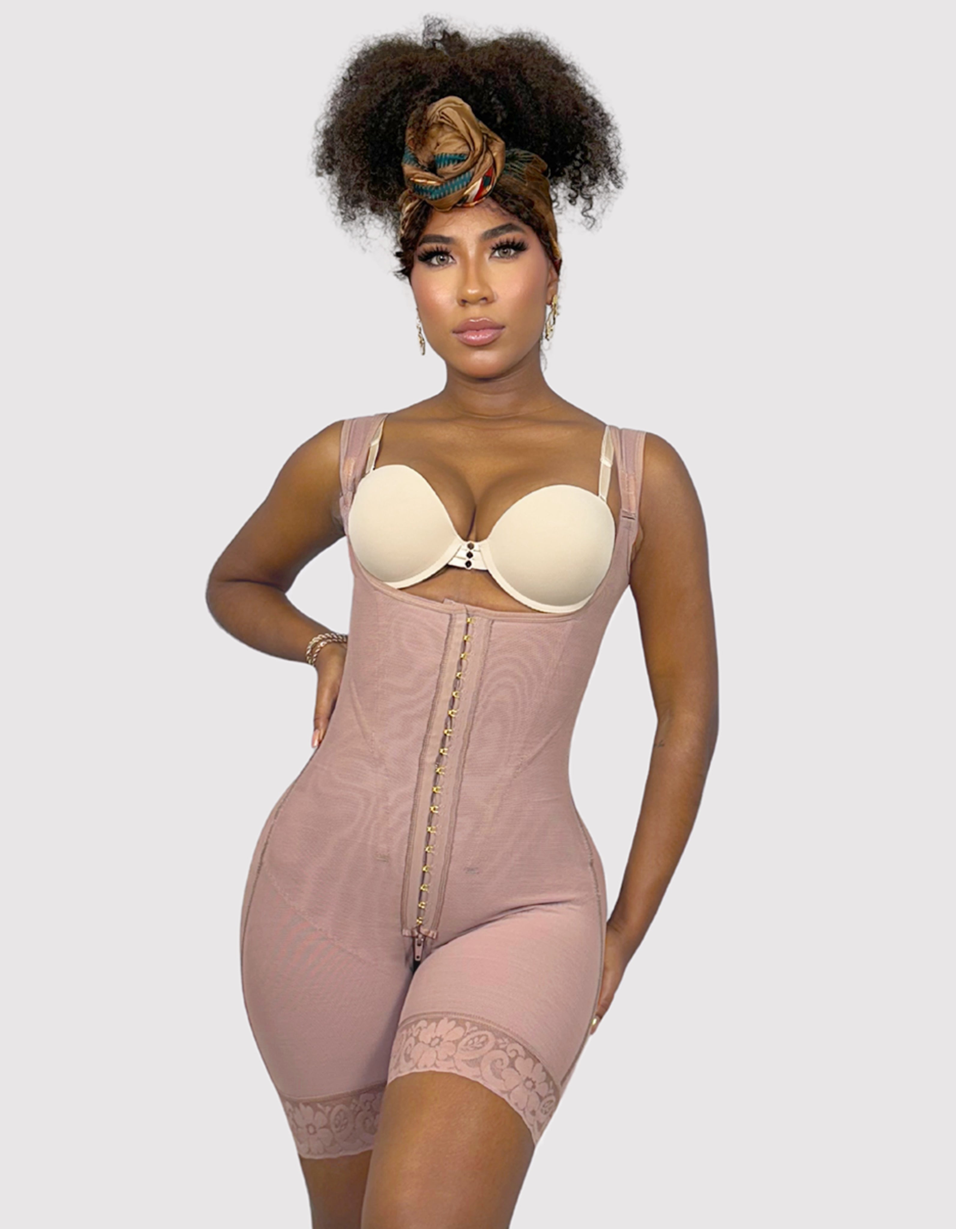 This high-compression full-body fajar is engineered for maximum shaping, structure, and support. Made with Powernet and Lycra, it features 9 strategically placed flexi-bones that enhance posture, define the waist, and control the abdomen and back. Designed with a semi-invisible hybrid finish, it combines sculpting power with sleek discretion under clothing.