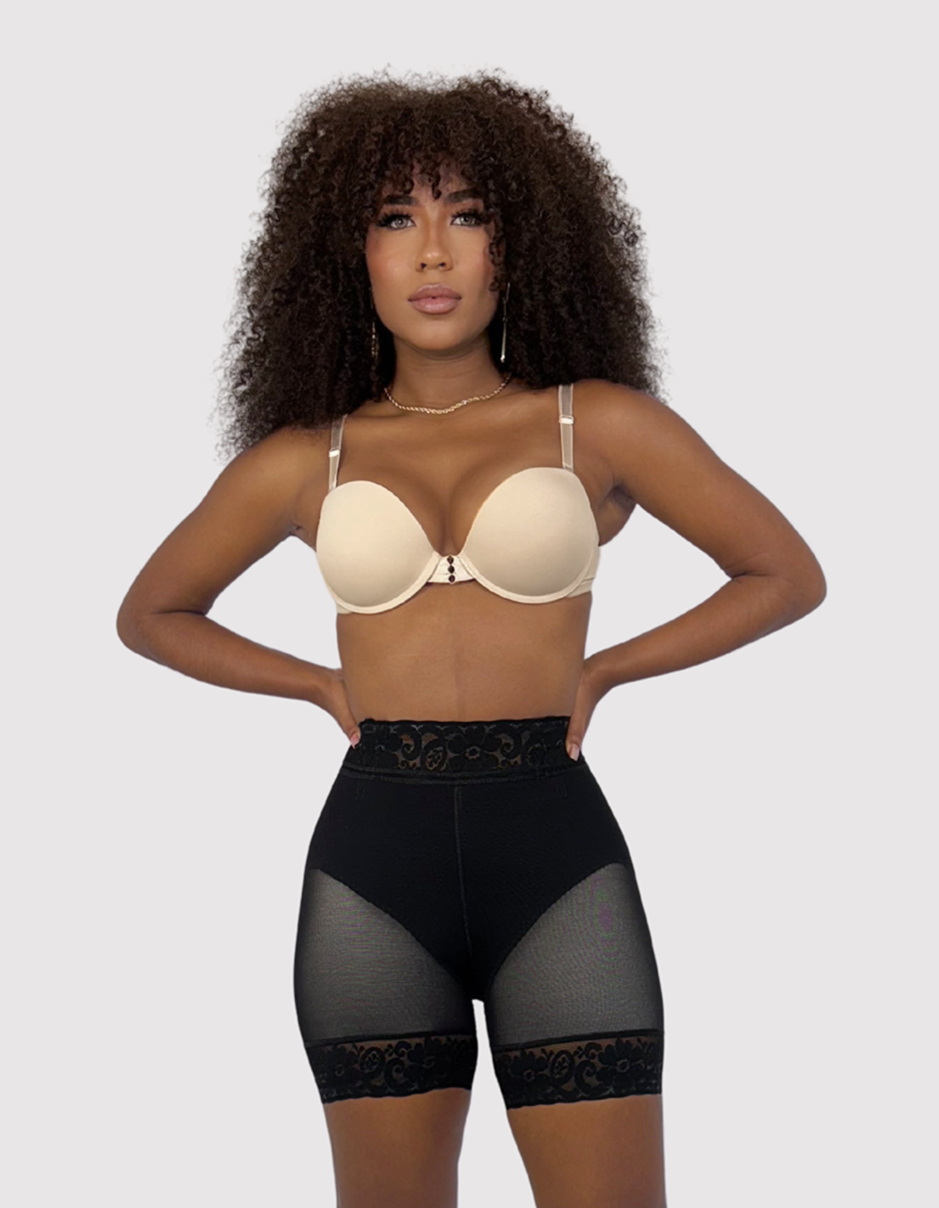 This semi-invisible short is designed for comfort, support, and a flattering fit. Featuring transparent mesh at the back and no side seams, it provides a smooth, seamless look while offering targeted control. Made from lightweight power fabric, it shapes the abdomen, hips, and buttocks, ensuring a sculpted silhouette with added sensuality.