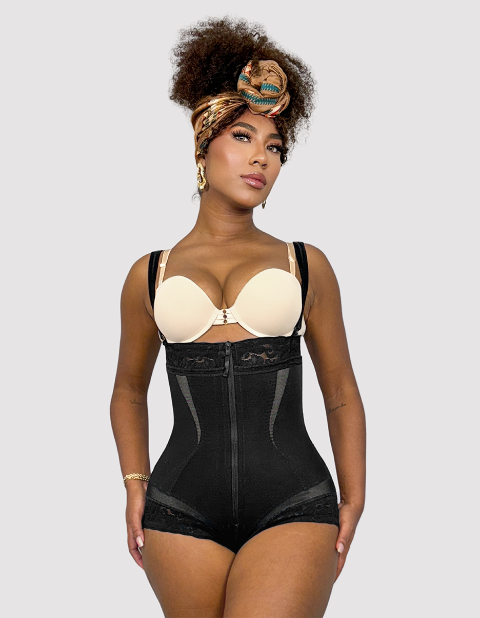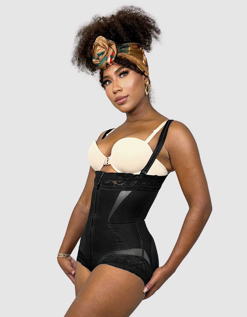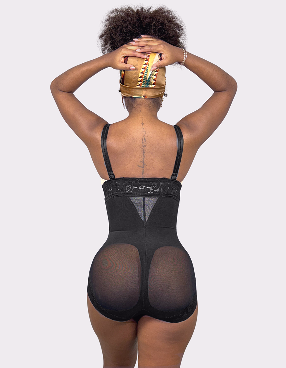 This strapless cheeky-style shapewear blends sculpting power with lingerie-inspired elegance. Made from lightweight power fabric with localized transparency, it offers high compression where needed while remaining soft, breathable, and visually delicate. Its refined lace details, removable straps, and sensual design make it as beautiful as it is functional.
