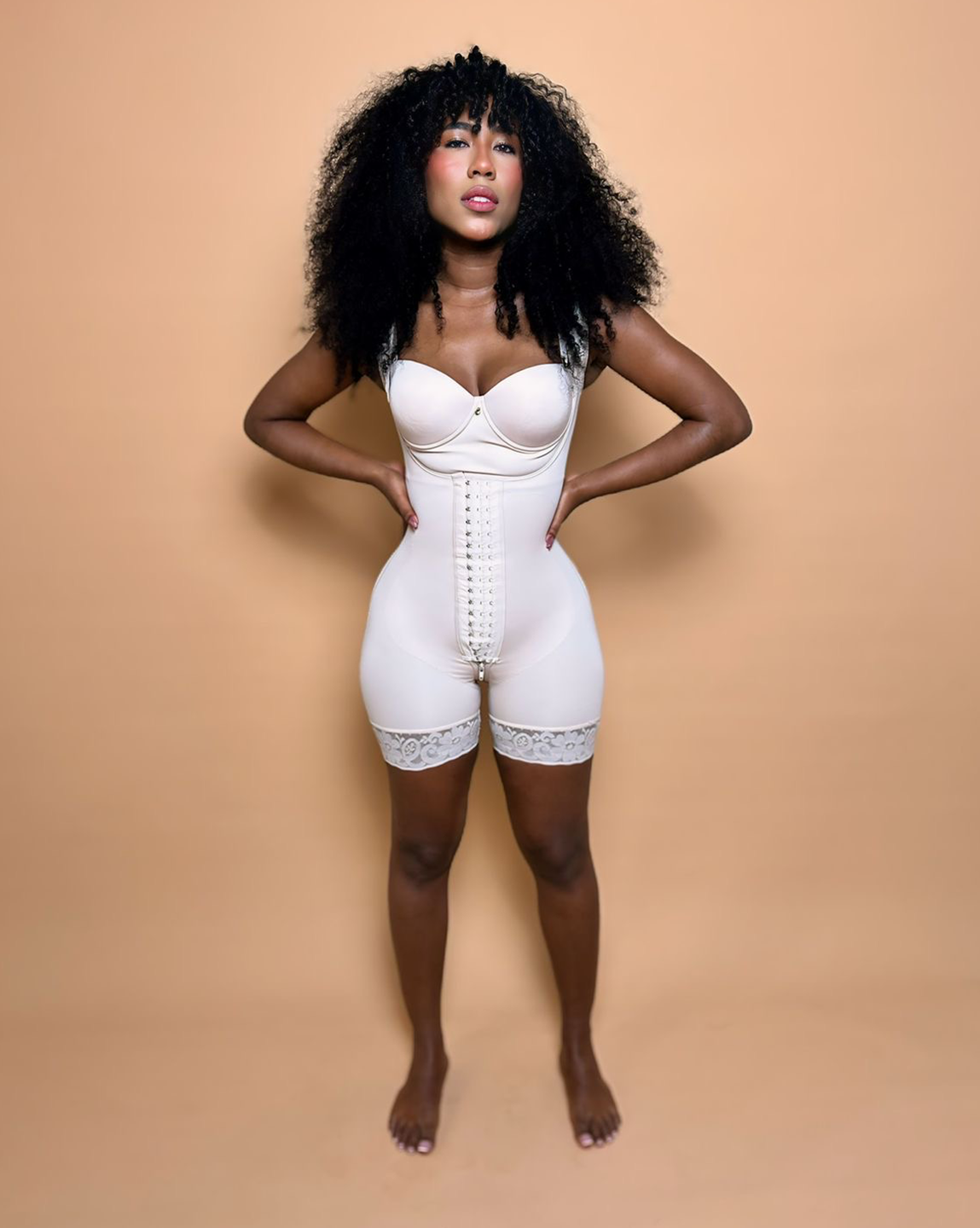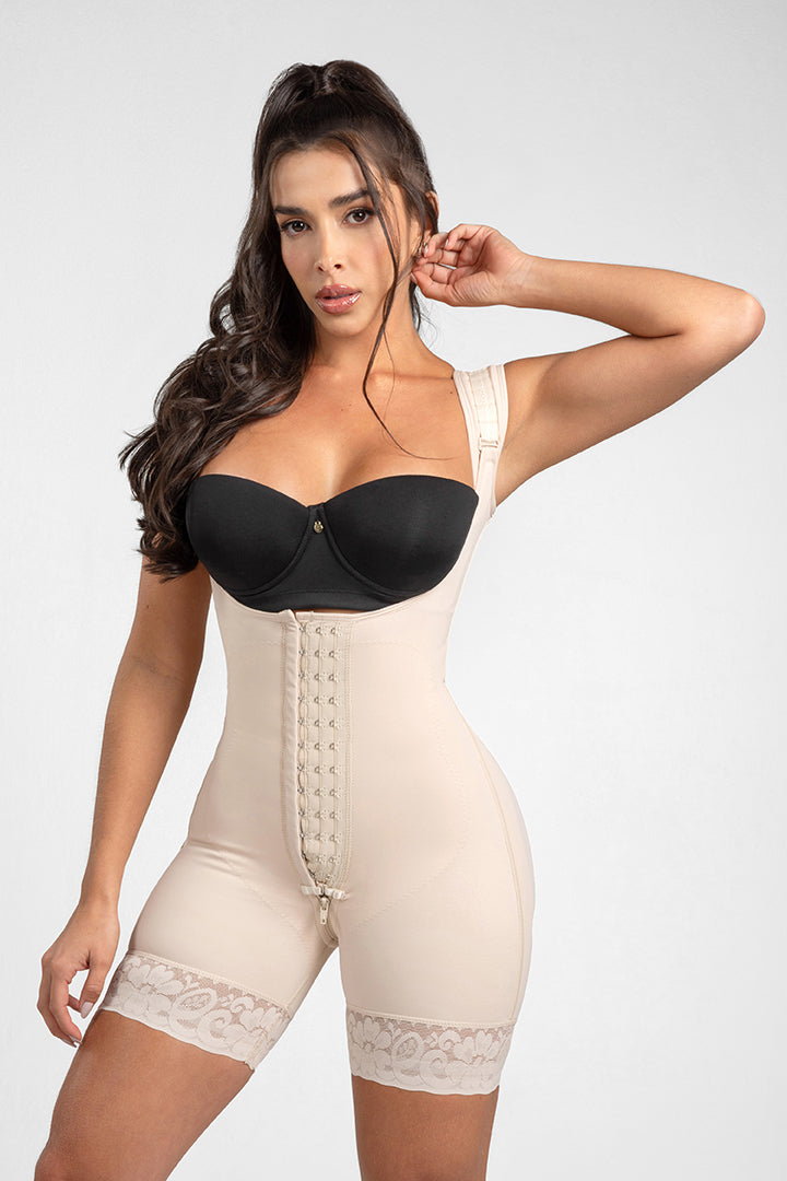 This post-surgical bodysuit has a full back coverage and lifts the butt. It has a 7-position adjustable shoulder with pads for maximum comfort.