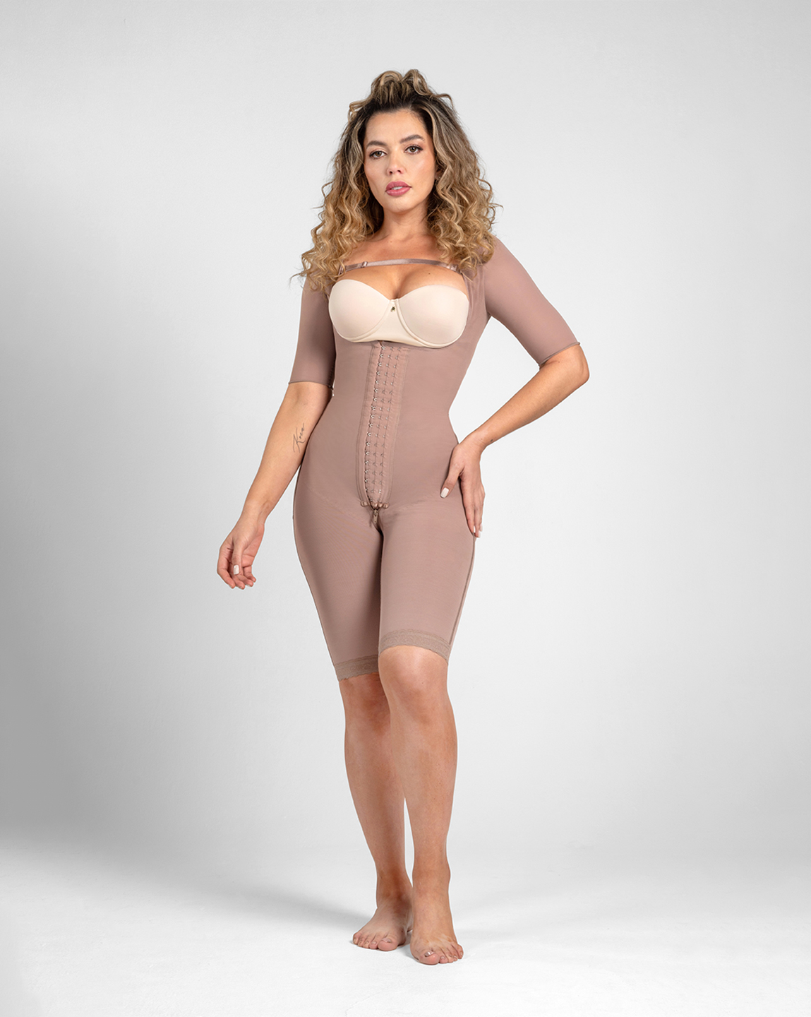 This all in-one faja provides full coverage from your arms down to your thighs, giving you a smooth and seamless silhouette.