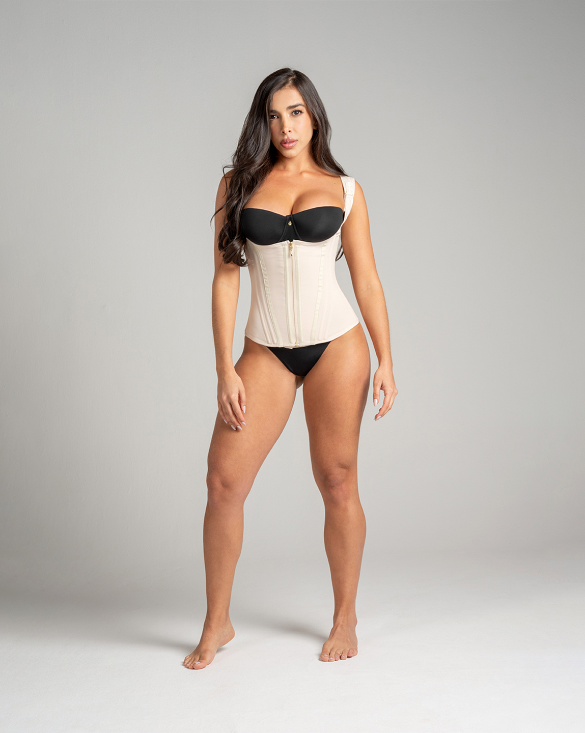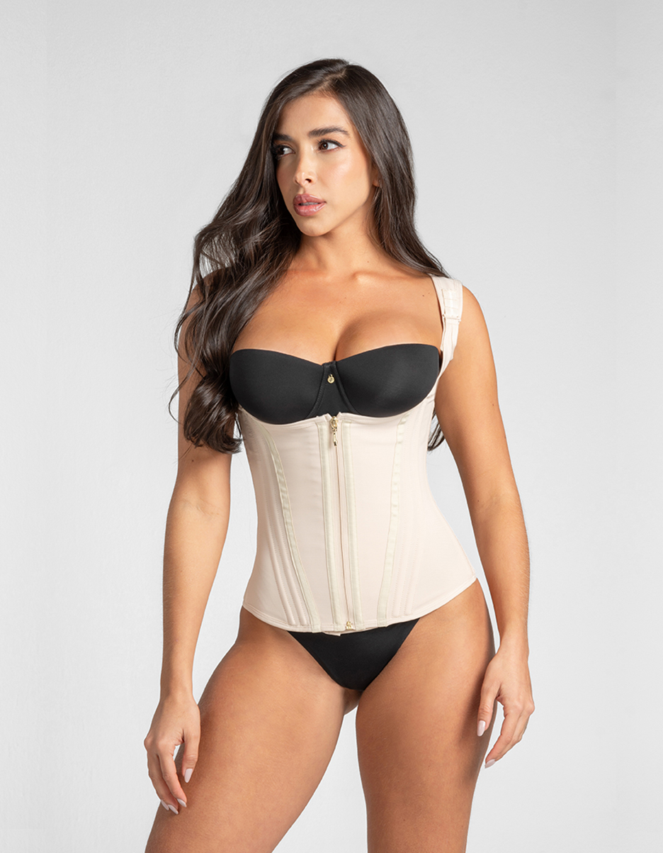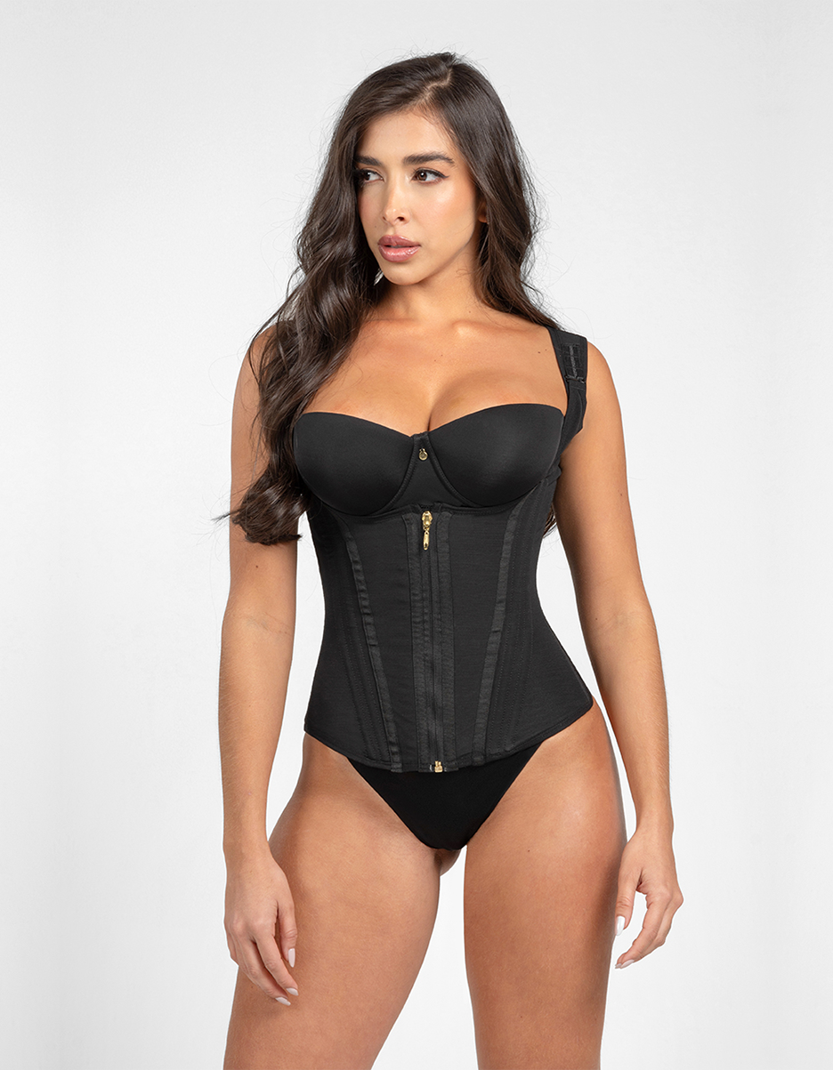 - 6-position shoulder adjustment for a personalized fit. - 15 bonings strategically placed to create the coveted hourglass figure
