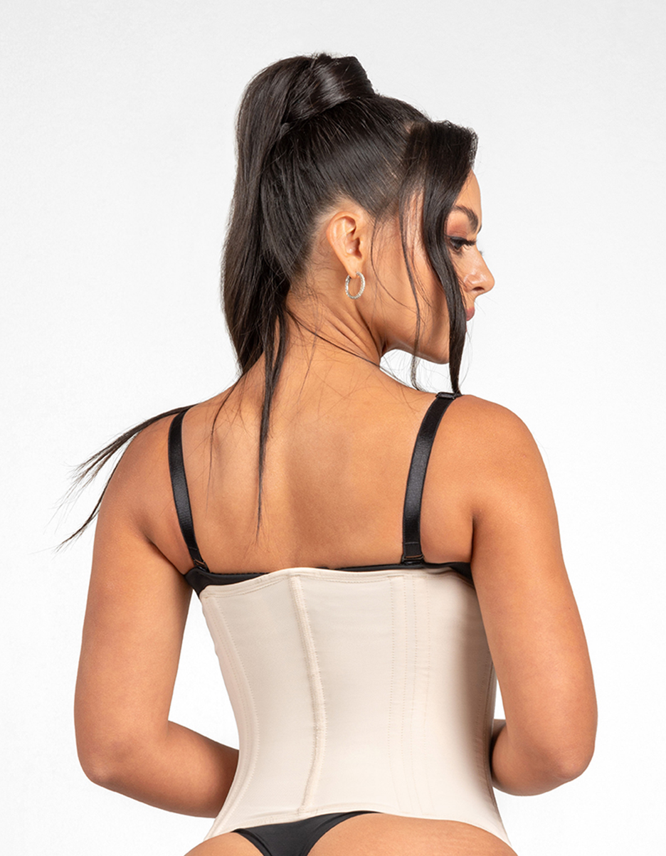 - 6-position shoulder adjustment for a personalized fit. - 15 bonings strategically placed to create the coveted hourglass figure